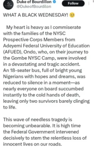 Social media users expressed shock and grief over the tragedy. One user, DukeofBourdillion, wrote: “WHAT A BLACK WEDNESDAY! My heart is heavy as I commiserate with the families of the NYSC Prospective Corps Members from Adeyemi Federal University of Education (AFUED), Ondo, who, on their journey to the Gombe NYSC Camp, were involved in a devastating and tragic accident. An 18-seater bus, full of bright young Nigerians with hopes and dreams, was reduced to silence in a moment—as nearly everyone on board succumbed instantly to the cold hands of death, leaving only two survivors barely clinging to life.”