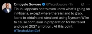 Sowore wrote that Tinubu “appears not to even know what’s going on in Nigeria, except where there is land to grab, loans to obtain and steal, and using Nyesom Wike to cause confusion.” He ended the post with the hashtag #TinubuMustGo, calling for the president’s resignation.
