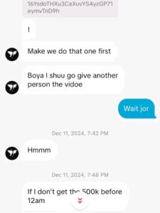 The latest development centers on a chat dated December 11, 2024, allegedly sent by an individual identified as Mohbad’s brother, Adura. In the conversation shared by Fabiyi, the individual claimed to possess a video recording of a confrontation involving the late singer and a woman named Cynthia. According to the message, the video purportedly captured a moment where Mohbad’s wife, Olawumi, allegedly pushed him, causing him to hit his head on the floor. The individual then demanded the sum of three million naira in exchange for releasing the footage.