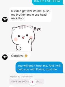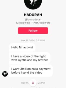 The message reads: “Hello Mr activist. I’ve a video of the fight with Cynthia and my brother. I want 3 million naira before I send the video. The video get where Wunmi push my brother and e use his head nack floor.”