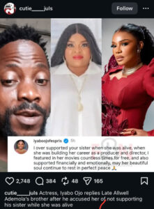 “Where Were You When My Sister Needed You?” – Late Allwell Ademola’s Brother Calls Out Nollywood Stars, Iyabo Ojo Responds