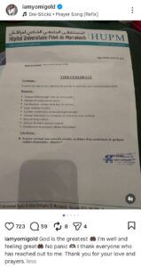 “Life truly lives in seconds. A sudden headache nearly took me out, but by God’s mercy and the swift help of the emergency team in Marrakech, I’m here resting and recovering.