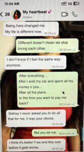 In one of the messages, she allegedly told him she feared he might regret selling his car and spending so much money on her relocation.