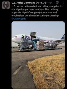 AFRICOM confirmed the delivery in a statement shared on its official X (formerly Twitter) handle on Tuesday, noting that the supplies were aimed at strengthening Nigeria’s operational capacity.