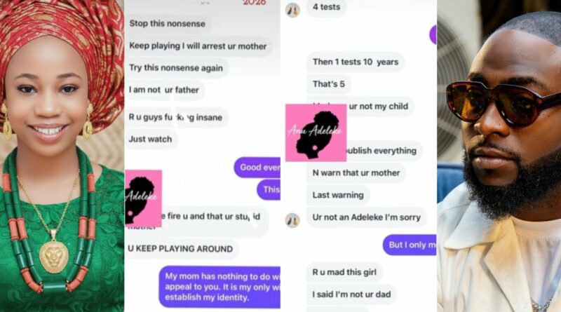 Anu Adeleke, the young girl whose mother has previously claimed that Afrobeats superstar David Adeleke (Davido) is her biological father, has shared what she described as an alleged private chat with the singer following her recent public call for a DNA test. Eyes Of Lagos reports,