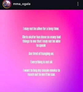 “Chris Okafor has done so many bad things to me that I might not be able to speak. Everything is not okay,” she wrote.