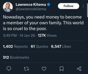 In a post shared on X (formerly Twitter), Kitema expressed frustration over what he sees as increasing cruelty toward poor people, claiming that financial status has become a determining factor for respect and inclusion—even among family members who are expected to offer unconditional support. Eyes Of Lagos reports,