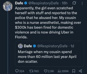 “My cousin who is a nurse anesthetist, making over $300k, has been fired for domestic violence and is now driving Uber in Florida,” the man added.