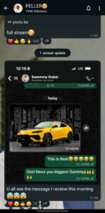 The development surfaced after screenshots of an alleged WhatsApp conversation between Peller and the Dubai billionaire began circulating widely across social media platforms. In the chat, SammyDubai was reportedly seen promising to gift the influencer a yellow Lamborghini Urus, while also sharing a sample image of the luxury vehicle said to be prepared for shipment to Nigeria. Eyes Of Lagos reports,