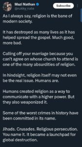 In a post that quickly gained traction across several platforms, the man argued that religion has had a greater negative impact on society than the positive influence often associated with faith and spiritual teachings. Eyes Of Lagos reports,