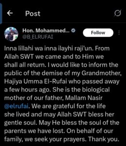 In a post shared on X (formerly Twitter), Mohammed Bello revealed that his grandmother passed away a few hours earlier. However, he did not disclose the cause or circumstances surrounding her death.