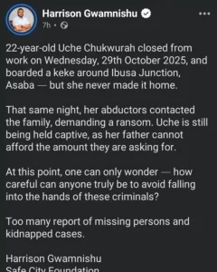 “Uche closed from work on Wednesday, October 29, 2025, and boarded a keke around Ibusa Junction, Asaba, but she never made it home,” Gwamnishu wrote. “That same night, her abductors contacted the family, demanding a ransom. Uche is still being held captive as her father cannot afford the amount they are asking for.”