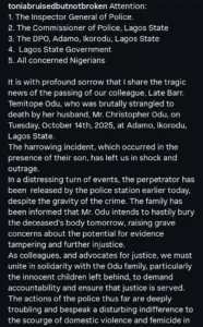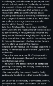 Activists are urging the Nigerian Police Force, the Ministry of Justice, and the National Human Rights Commission to take up the case and ensure that justice is not only served for Barrister Odu but that the nation’s laws protect other women facing similar abuse.