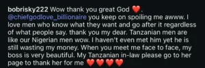 “@chiefgodlove_billionaire, you keep spoiling me. I love men who know what they want and go after it regardless of what people say. Tanzanian men are just like Nigerian men. I haven’t even met him yet and he’s already spending on me.”
