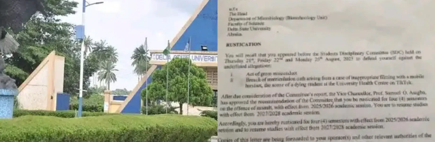 Delta State University (DELSU), Abraka, has suspended a 200-level Biotechnology student, Ezi Ugoma, for two academic sessions over a controversial video showing a dying student.