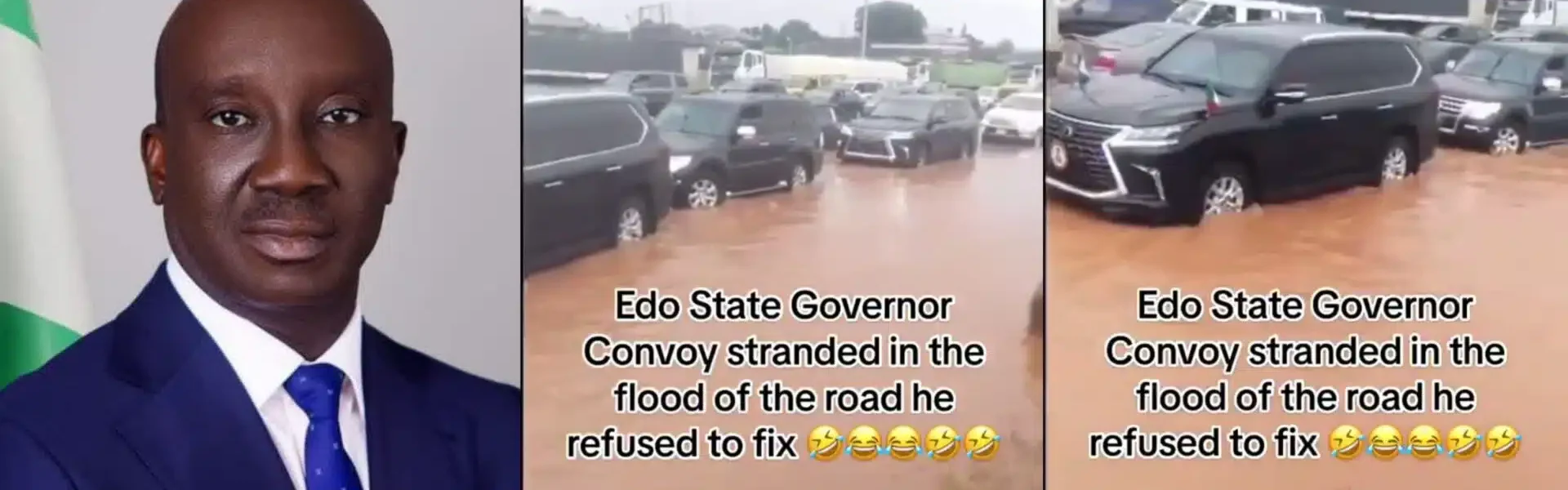 Edo Governor’s Convoy Stuck in Flooded Benin Road Sparks Outrage and Mockery Online