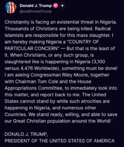 Nigeria is no stranger to religious and ethno-sectarian violence, particularly in regions where herders, farmers, and militant groups clash. However, Trump’s framing as a targeted massacre of Christians elevates the matter to an international diplomatic level. His statement has already reverberated across media outlets.